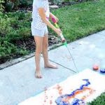 For an added twist, parents can create a bullseye, tic tac toe, or numbered squares on the paper and hang up for fun games. For the numbered squares, you can shout out math problems and the little artist can blast their paint at the answer. Families can also play hopscotch and squirt the square instead of tossing a rock. This is a messy activity, but with washable paint, it will all wash away.