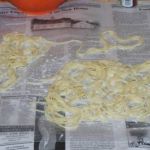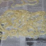 • A few strands at a time, dip of the cold spaghetti into the white glue.