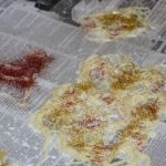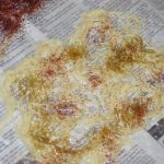 • Sprinkle the arranged gluey connecting strands of spaghetti with carious colors of glitter.