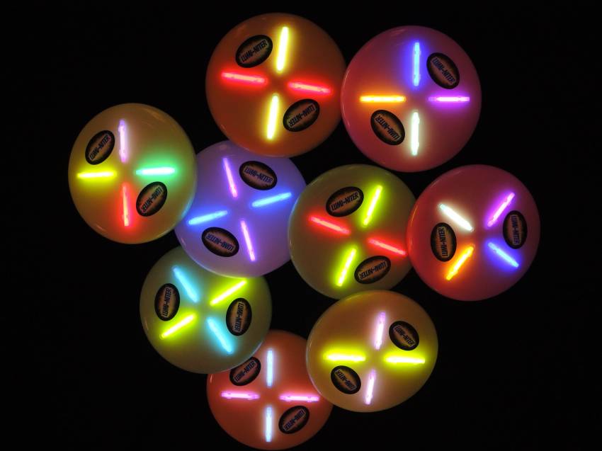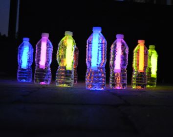 Creative note: We actually came up with the idea to put some glow sticks into some clear plastic water bottles to make "lanterns" and circled them up to make "targets" to toss into. (The glowsticks shown in the bottles below are larger than the ones used in the Lumi-Niter, however thin ones would work fine too). We made 2 circles of glowing bottles about 10 feet apart and then stood back and see who could toss their glowing Lumi-Niter into the center first.