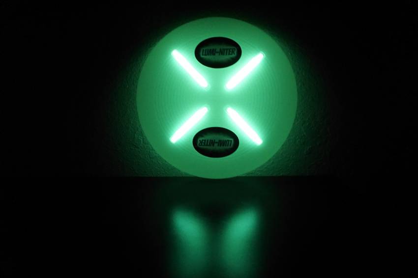 The disc immediately starts to reflect the glow as a result of the glow sticks, and allows you to clearly see & toss it around in the dark. The rotation when tossed properly makes it look like a cool flying saucer. You can choose to use 1 color glow stick or try 4 different ones for different glowing effects. The disc itself is not glow in that dark - but once you activate and insert the glow sticks they will last for up to 8 hours so you'll be ready to go.