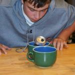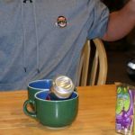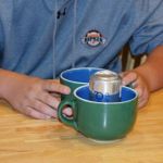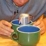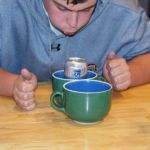 - Blow air into the space between the mug and the soda can which will cause the can to "jump" into the other mug.