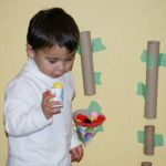 Keep your toddler happily entertained with this simple paper tube wall activity. Little kids will enjoy the repetitive play while learning about cause and effect and even colors. Engage with your child and ask them to pick up the pom poms by color, allow them to freely drop the pom poms into the tubes and always mirror they excitement as they play.