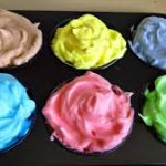 2. Mix food coloring in the muffin cups and mix well to create colorful cups of foam.